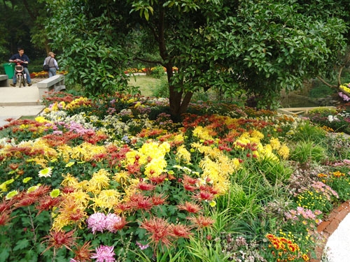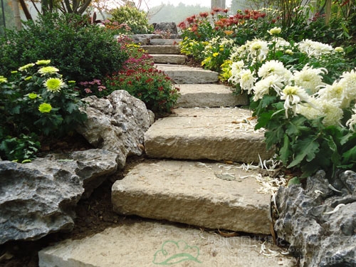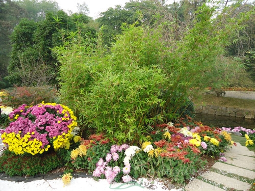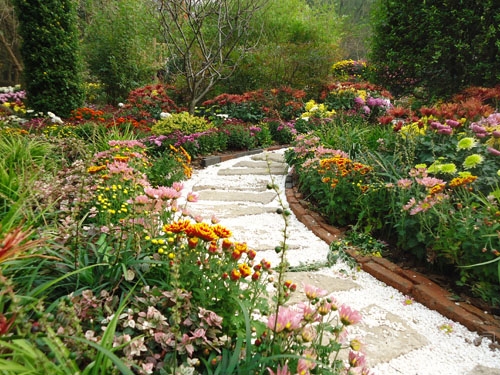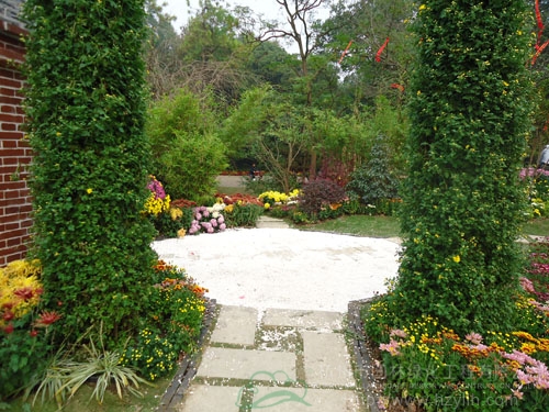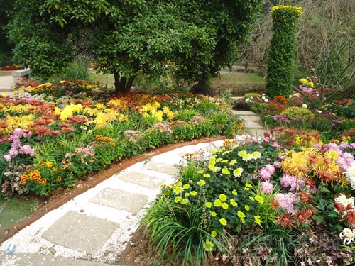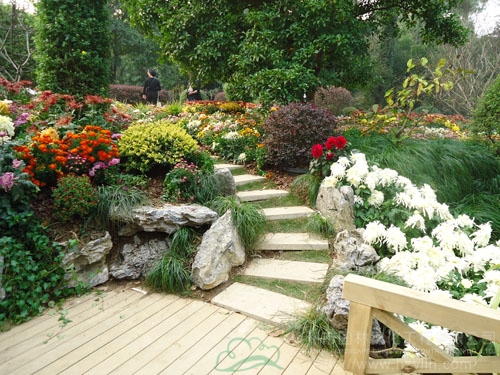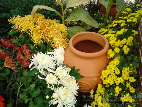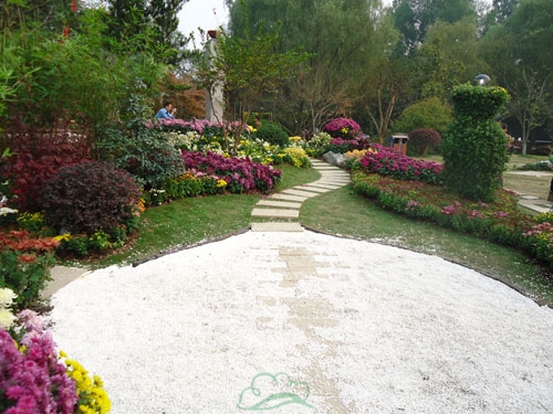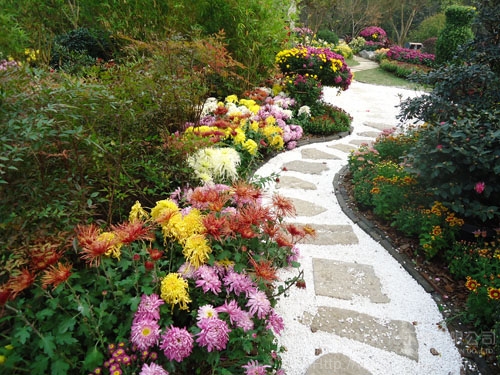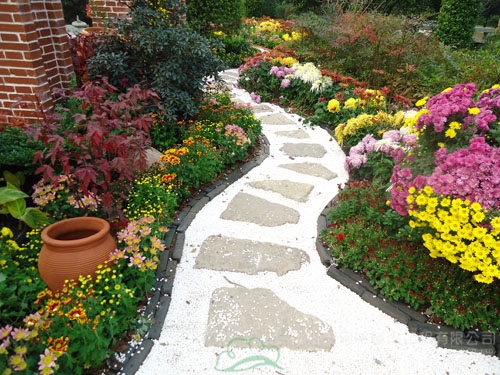 蜿蜒的園路、白色的石子、紅色的陶罐、盛開(kāi)的菊花