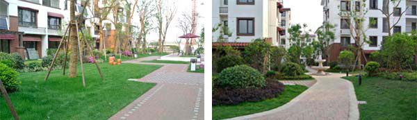 楊經(jīng)理說(shuō):"紫荊東郡的植物配置以統(tǒng)一中富于變化為原則,上層苗木主要選擇大規(guī)格的香樟、無(wú)患子和馬褂木等,中下層則以桂花、雞爪槭、紅葉石楠球、金森女貞球等常見(jiàn)的球類灌木及地被苗進(jìn)行組團(tuán),苗木的種類雖然不是很豐富,但在配置上卻形式多樣,特別是通過(guò)在施工時(shí)對(duì)設(shè)計(jì)的再深化,要求在植物種植時(shí),樹(shù)形、色彩、線條、質(zhì)地及比例都要有一定的差異和變化,顯示多樣性,但相互之間又有一定的相似性,從而使得整體的植物配置在和諧統(tǒng)一中顯得生動(dòng)活潑,簡(jiǎn)單而不單調(diào),統(tǒng)一而不呆板,營(yíng)造出一種寧?kù)o、閑適的氛圍。"