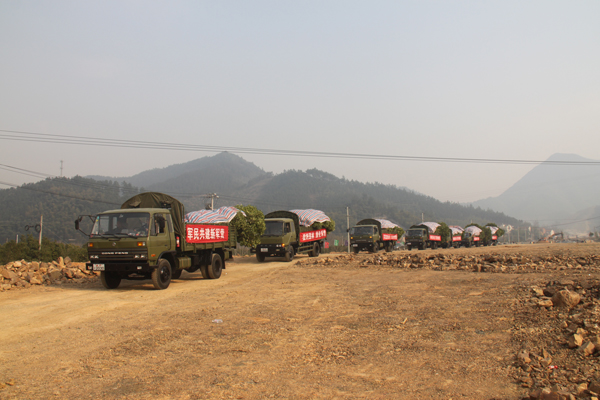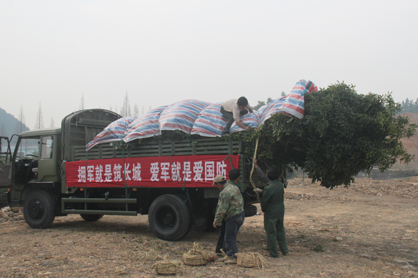 下午3點(diǎn)50分,八輛一字排開(kāi)的軍車(chē)全部裝上了苗木,并進(jìn)行了仔細(xì)的遮蓋和捆綁。隨后,在噼噼叭叭的鞭炮歡送聲中,車(chē)輛徐徐開(kāi)出基地,向舟山方向駛?cè)ァ?/p>