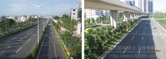 國道205深圳段改建工程景觀綠化工程G5402標(biāo)段,是深圳市龍崗區(qū)迎大運重點景觀工程,位于國道205深圳段龍崗區(qū)地鐵三號線愛聯(lián)地鐵站至坪地與惠州市交界處,總綠化面積210000㎡?!耙匀藶楸?,尊重自然”、“ 處處有綠葉、無處不飛花”等設(shè)計理念貫穿于工程始終,整條中央綠化帶位于高架橋下,長勢茂盛的各類植物形成一條色彩繽紛的彩帶擁簇著高架橋段,使整條橋段與綠化景觀有機(jī)融合。整條道路的景觀,不僅體顯出一個濱海大都市獨有的景觀特色,更彰顯出這個城市的生機(jī)活力與熱情奔放。