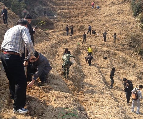 此次種植的是油茶小苗,為了提高樹苗的成活率,專門請來當地農民,詳細講解種植的步驟、間距等種植要點及注意事項。隨后,大家兩人一組,興致高昂地開始了種樹,挖穴、種苗、填土……經過一個小時的緊張勞動,500多株油茶樹就種好了。