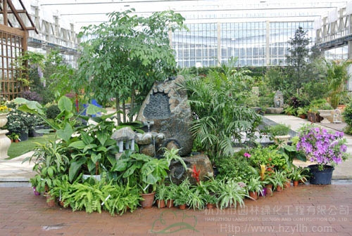 走進(jìn)玻璃溫室的大門,一處小巧別致的水景,掩映在一片綠色中,古樸而有趣的石頭,細(xì)細(xì)的流水,勾勒出一幅恬靜的畫面。兩邊是花園中心的英文縮寫GARDEN CENTER,每一個(gè)英文字母都是一個(gè)小噴泉,流水不斷,與怒放的杜鵑花一起,奏響春天的歡快旋律,拉開青山湖?花園中心中庭景觀的序幕。