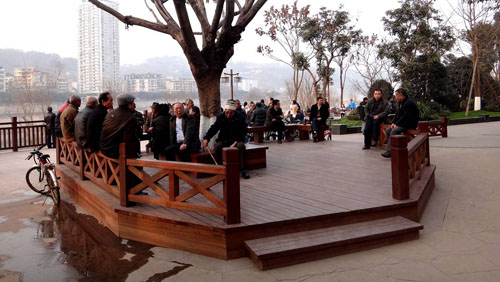 “我們將館驛嘴廣場(chǎng)的設(shè)計(jì)基調(diào)定位為‘奢華’, 是指使用的材料要‘真材實(shí)料’,施工工藝要經(jīng)得起考驗(yàn)。”李壽仁邊走邊介紹說(shuō),“漣漪廣場(chǎng)上的冰裂紋圖案鋪裝,采用兩種顏色的花崗巖,為了營(yíng)造出氣泡的效果,特意將圓形的花崗巖用不繡鋼鑲邊,加深色彩,形成對(duì)比,從而營(yíng)造出‘激起漣漪無(wú)數(shù)’的奧妙,實(shí)現(xiàn)館驛嘴這艘航船動(dòng)起來(lái)的效果,為了保證施工質(zhì)量,工人都是從杭州請(qǐng)來(lái)的專(zhuān)業(yè)人員;所有的青石鋪裝,全部采用人工石刻,我們現(xiàn)在看到的這些菠蘿面、荔枝面等紋路,是幾百名能工巧匠一鑿一鑿刻出來(lái)的,這種自然、厚重、原生態(tài)的質(zhì)樸美,是機(jī)器切割無(wú)法實(shí)現(xiàn)的,更重要的是,大量青石的運(yùn)用,可以有效抵抗洪水的沖刷,就算50年一遇的洪水來(lái)襲也不怕;反映瀘州民俗生活的三缺一麻將雕塑,則是用全銅制作,人物形態(tài)惟妙惟肖,紋路雕刻精致細(xì)膩,彰顯出工藝的用心和考究;亭、廊等木結(jié)構(gòu)建筑則采用實(shí)木制作,對(duì)木質(zhì)材料和厚度都有嚴(yán)格的要求,達(dá)到美觀與實(shí)用兼顧的要求?!?/p>