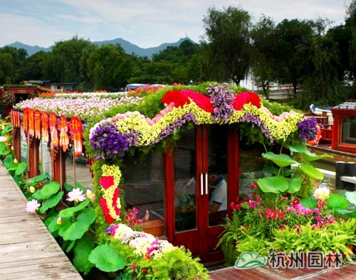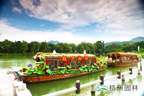 藝術節(jié)期間,首次在西湖湖面上配置6艘荷花花船,極大地提高了荷花節(jié)的觀賞性和趣味性,成為西湖中一道流動的荷花美景。其中,由杭州市園林綠化股份有限公司設計制作的“魅力西湖”荷花游船,將插花技藝與園林布景手法有機結合,用康乃馨、勿忘我、太陽花等與荷花組景,既突顯了“主角”荷花的秀麗、典雅,又使整艘船的色彩明艷豐富,將熱鬧的節(jié)日氛圍巧妙烘托。