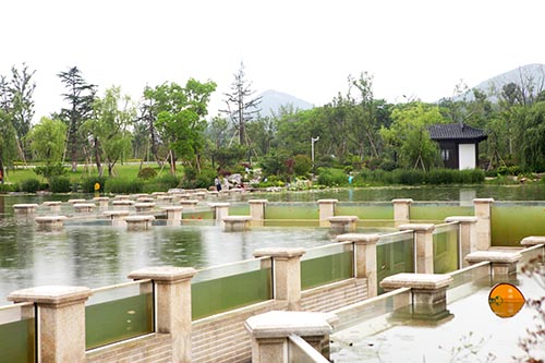 施工技術(shù)的創(chuàng)新以沉水廊道為代表。沉水廊道總長148米,是中國目前最長的廊道景觀,工程量大,施工條件復(fù)雜,面對的技術(shù)難題多。施工的最大難點是廊道防滲排水、基礎(chǔ)沉降及廊體抗浮處理等技術(shù)環(huán)節(jié)。通過技術(shù)團隊的多次攻關(guān),最終解決了廊道不沉降、廊道結(jié)構(gòu)穩(wěn)定、結(jié)構(gòu)防水等問題,形成了獨具特色的長廊技術(shù)施工特色。
