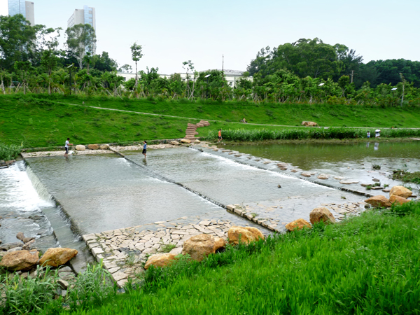 該工程完工后,淺而寬闊的河道,清亮透徹的河水,駁岸上青青的草地,色彩艷麗的花卉,極具創(chuàng)意的硬質(zhì)小景,小巧的疊水平臺……如畫的生態(tài)美景和多彩的濱河景觀讓人備感身以愉悅,成為深圳市民散步休閑的好去處。