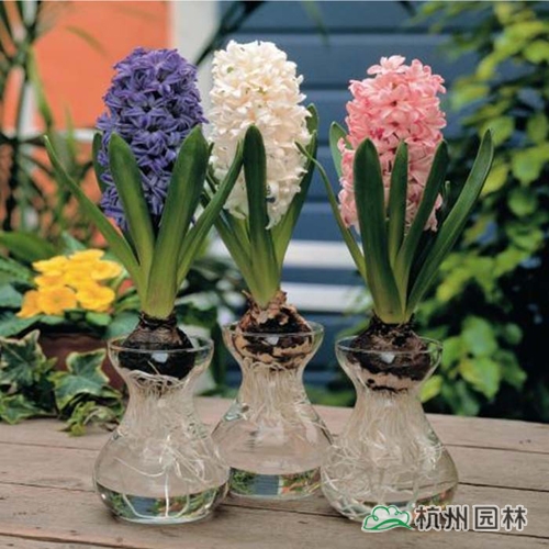 風(fēng)信子:目前市場上常見的風(fēng)信子有粉、藍(lán)、玫紅、紫、白等品種,其中以藍(lán)、粉、紫最受歡迎。選購時要挑個頭大而飽滿的,抓在手上硬實偏重,根部不發(fā)霉,生長點未受破壞的種球。11月下旬種植,在陰冷的環(huán)境下放置兩個月左右,這樣處理可以減少后期夾箭的概率,也有利于根系的生長,待花芽長至5cm左右時移至光線充足的區(qū)域即可。風(fēng)信子也可水培,但較盆栽一般花箭短、花朵少,花期也會短一周左右。