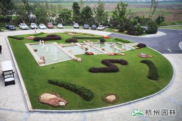 2號(hào)樓大廳門(mén)前,在大面積的草坪上,選用紅花檵木、金邊胡頹子、茶梅等一些小毛球,用中國(guó)書(shū)法的用筆法則,十分簡(jiǎn)潔地“書(shū)寫(xiě)”出點(diǎn)、橫、豎、鉤、提、撇、短、捺,即代表中國(guó)書(shū)法中筆畫(huà)大體的“永”字八法,傳達(dá)出“大道至簡(jiǎn)”的書(shū)法精髓。這種匠心獨(dú)運(yùn)的植物配置,將園林的造景手法與中國(guó)書(shū)法藝術(shù)完美配合,景觀效果令人耳目一新,使項(xiàng)目的整體景觀品位得到了質(zhì)的提升,是中國(guó)傳統(tǒng)園林造景手法的典型運(yùn)用。