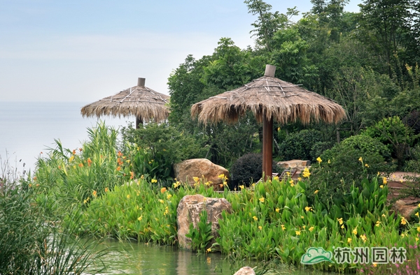 觀景平臺(tái)拉近了人與湖水的距離,滿(mǎn)足了人們親水的愿望,這僅僅是湖岸風(fēng)光的一部分。為了營(yíng)造出獨(dú)特的濱湖風(fēng)光,沿湖駁岸的處理手法還有很多,如草坪入水、水中放置景石等,并大量種植梭魚(yú)草、鳶尾、水生美人蕉、旱傘草、再力花等水生植物,岸邊則大量應(yīng)用野山石疊石,搭配桅子花、杜鵑花、花葉絡(luò)石、八仙花、紅葉石楠球、無(wú)刺枸骨球等植物,不但對(duì)駁岸起到了保護(hù)作用,而且人為地創(chuàng)造了豐枯水時(shí)皆有景可觀的景致??芍^是水落石出、風(fēng)聲水起,雖由人作、宛自天開(kāi)。