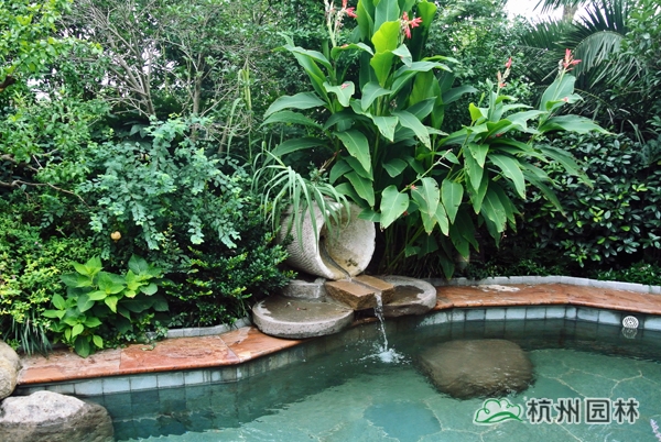 五千年的中國(guó)歷史文化,恢宏浩瀚,為園林造景提供了取之不竭的素材;園林景觀,也因?yàn)閭鞒辛松詈竦奈幕滋N(yùn)而散發(fā)出獨(dú)特的藝術(shù)魅力。作為一個(gè)旅游度假項(xiàng)目,對(duì)園林景觀的要求,不僅僅只是精致大氣、風(fēng)韻天成的美景,更需要有深厚的文化底蘊(yùn),彰顯獨(dú)一無(wú)二的中國(guó)元素。為此,在2號(hào)樓大廳門(mén)前,用植物造景再現(xiàn)代表中國(guó)書(shū)法中筆畫(huà)大體的“永”字八法,彰顯中國(guó)書(shū)法的魅力;在泡池的建造上,運(yùn)用老石碾、壓門(mén)石、老磨盤(pán)等老石材,打造出懷舊氣息濃郁的鄉(xiāng)土風(fēng)情。