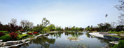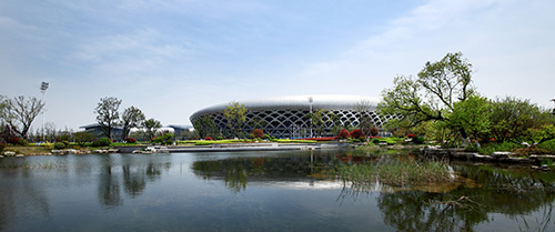 據(jù)夏修智介紹,奧體公園是工程的主要景觀節(jié)點,位于奧體中心西北側(cè),面積約5萬平方米,是一座集娛樂、運動為一體的特色濱水運動公園,也是整個奧體中心的“綠肺”。一條蜿蜒的河流將公園劃分為東部運動區(qū)和西部休閑公園區(qū)。運動區(qū)緊挨訓練中心,東側(cè)便是足球場、籃球場和排球場,運動后就能感受到融入大自然的清新;休閑公園區(qū)包括入口廣場、樹陣廣場、以及河水匯聚而成的小人工湖,湖邊蘆葦迎風擺動,湖水清澈見底,鵝卵石鋪就的湖底清晰可見。整個奧體公園以中國古典園林為主、回歸自然的組團式造景手法,強調(diào)休閑、幽靜、生態(tài)自然。從西入口廣場的草坡,逐漸過渡到觀賞性強的觀花、觀葉園林樹種,配合灌木、草木、地被形成人為景觀,從西到東植物次第減少,層次不斷變化,形成了從自然生態(tài)狀綠化到人工幾何狀綠化的逐漸過渡,讓自然的活力與體育精神融為一體。