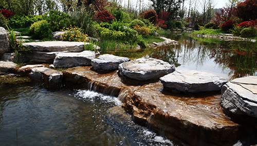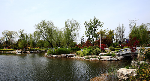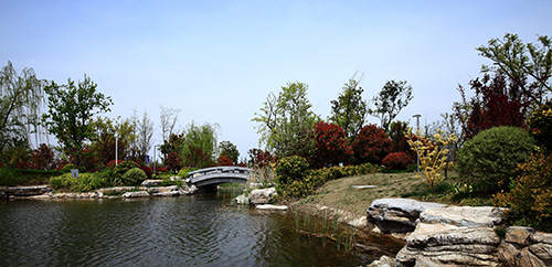 其中,人工湖面積7000平方米,小而精致,可謂是整個公園的“點睛之筆”。由親水平臺區(qū),源頭區(qū),中心湖面區(qū),鄰水生態(tài)區(qū),橋梁區(qū)構(gòu)成。湖面區(qū)域貫穿整個工程,沒有自然條件的襯托,完全由人工園林造景手法完成,在鄰水景觀帶種植睡蓮、荷花、再力花、千屈菜、鳶尾、蘆葦?shù)人参?,營造生態(tài)岸線,同時選擇其他親水植物,如美人蕉、碧桃、楊柳、水杉作為過渡和背景,虛實結(jié)合,營造出多方位的景觀效果。湖面雖小,但結(jié)構(gòu)完整,假山疊水,拱橋,原石臨水橋,湖邊卵石生態(tài)群落一應俱全。其中,景石主要使用了安徽的靈璧景石,約7000噸,堆疊出水源、暗橋、親水沿岸等景觀。