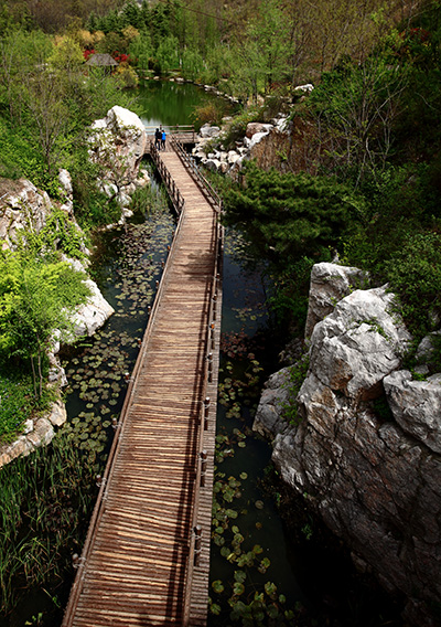 四大靜園位于北坡,分別名為彩徑觀花園、石林聽濤園、秀谷韻樂園和唱竹攬翠園,四個(gè)園子主題明確,景深豐富,個(gè)性分明,匠心獨(dú)具,一草一木別有風(fēng)韻。其中,石林聽濤園位于公園西南側(cè),是一座秀美的古典園林,具有濃郁的江南水鄉(xiāng)特色,由紅梅、南天竹、臘梅等植物組成的漂亮花境,給人帶來賞心悅目之感;蜿蜒曲折的木棧道則連接起了園內(nèi)的汀步和園路,帶領(lǐng)游人去欣賞園內(nèi)的每一處美景。唱竹攬翠園位于公園中部,全園格局顯得緊湊自然,豐富的植物應(yīng)用,使得園內(nèi)一年四季景色各異,特別是剛竹、紫竹、鳳尾竹、湘妃竹、慈孝竹等竹子的應(yīng)用,更是呼應(yīng)園名,行走在園內(nèi),伴隨著陣陣清風(fēng)徐來,讓人仿佛置身于“竹海聽濤”的悠閑意境中。