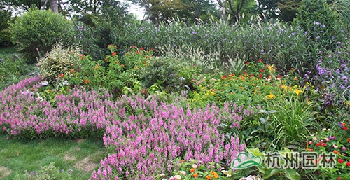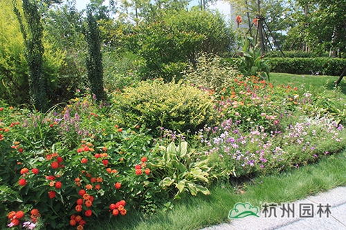 由于植物生長的季節(jié)性,在炎熱的八月份進行花境營造,不止考驗植物產品的適應性,更考驗施工技術。為了保證植物的成活率,這處花境中的植物都是精挑細選,從植物品種上考慮,挑選的都是適合夏季花境營造的植物,并且將宿根花卉與灌木、常綠植物與彩葉植物等有機結合,營造出絢麗多姿的花境景觀。為了保證工程進度,施工人員頂著烈日,冒著酷暑,不但在施工中精益求精,從地形營造、植物搭配、植物種植等各方面嚴格把關,在養(yǎng)護中更是用心,定時澆水,修剪干枯的枝葉等,保證了花境的景觀效果始終呈現出最佳狀態(tài)。