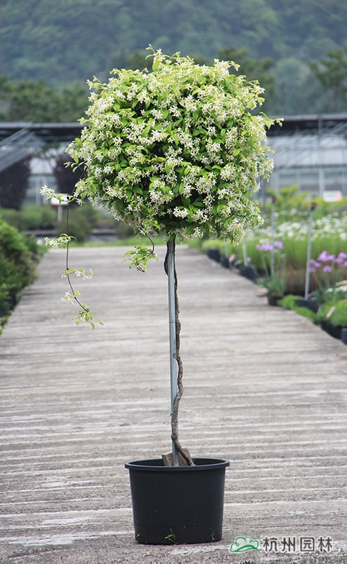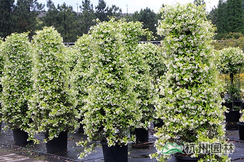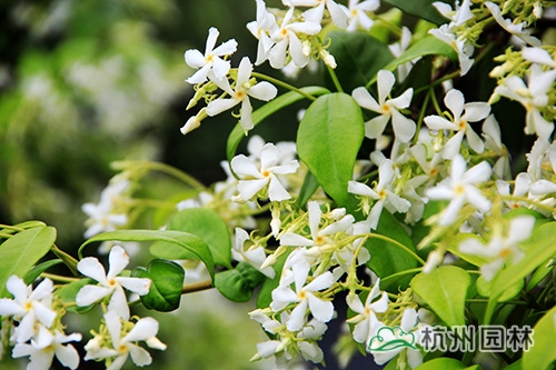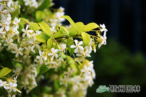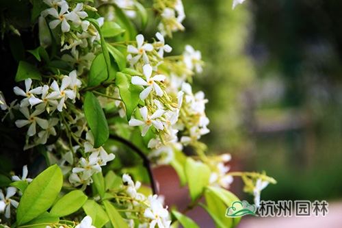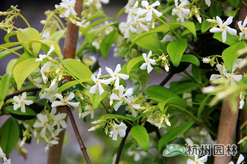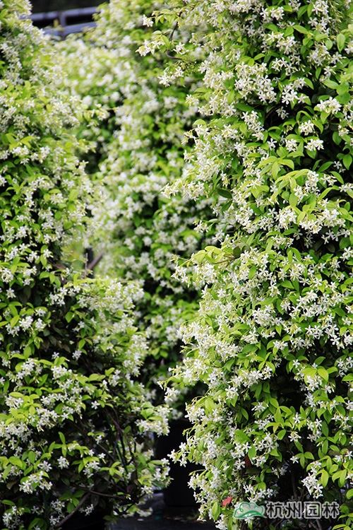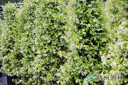 意大利白花絡(luò)石藤(Rhyncospermum jasminoides),俗稱風(fēng)車茉莉,為夾竹桃科的常綠藤本,莖赤褐色,幼枝被黃色柔毛長,有氣生根。常攀緣在樹木、巖石墻垣上生長,是一流的藤蔓植物,四季常綠。開花期在夏季,5月進(jìn)入盛花期,開花量極大,有茉莉的香味,聞起來沁人心脾。