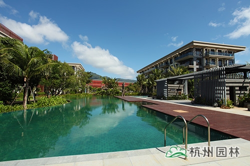項目位于海南省三亞市亞龍灣椰風路南部,整體景觀顯得張弛有度,開闊大氣的廣場鋪裝、宛若綠色地毯般的草坪、色彩豐富長勢茂盛的植物、藍寶石般的碧藍泳池……規(guī)整中不失自然,簡潔中深藏精致,盡顯現(xiàn)代主義風情的園林美景。