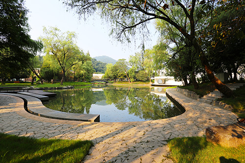 項目位于西湖區(qū)文一西路1000號,走在校園內(nèi),入目所及,豐富的植物組團與景石搭配的小景清新而自然;蜿蜒的園路旁,青青翠竹營造出幽靜的意境;溪水邊,古樸的亭子靜靜佇立成一道風景,柳楊依依,花兒綻放,植物的倒影在水中清晰如畫,一幅婉約的江南水景圖徐徐展現(xiàn)在眼前。