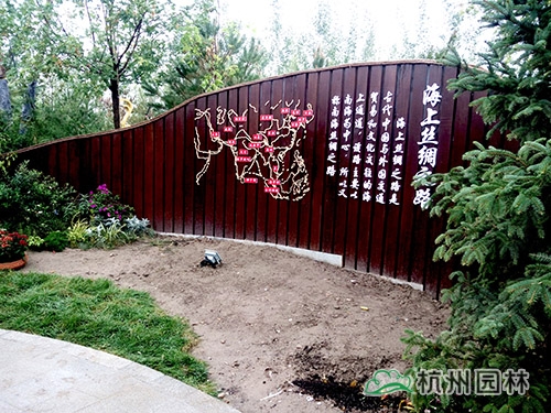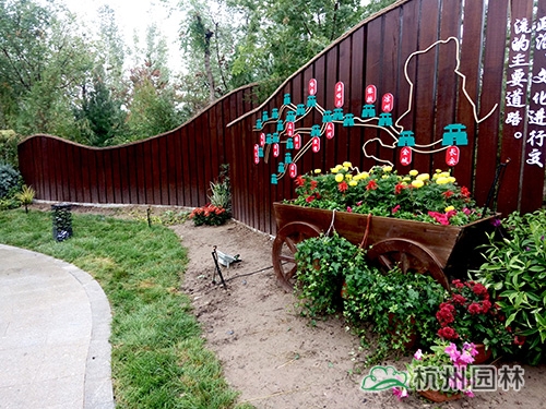 本處已有木制景墻做背景,花境施工前已在幾個(gè)節(jié)點(diǎn)放置了花車(chē)、木桶等,并栽植了一棵較高大的紅皮云杉,為花境營(yíng)造創(chuàng)造了良好的條件。結(jié)合景墻上的文字、地圖,以“陸上絲綢之路”文字為分界點(diǎn),營(yíng)造“絲?路”、“絲?念”兩組花境。