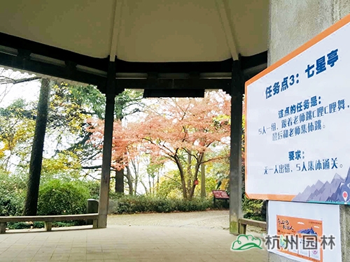 本次活動的終點為玉皇山頂?shù)摹敖挥[閣”。玉皇山是杭州絕佳的觀秋景高地,站在山頂,可俯瞰杭州全城,八卦田的神秘、西湖的絢麗等盡收眼底;山上則是古樹參天,紅葉似火,黃葉賽金,彩林岑巒疊峰,如入畫里。大家從玉皇山北門上山,途經(jīng)林海亭、老玉皇宮、櫻花地、紫來洞天、七星亭,最后到達山頂?shù)摹敖挥[閣”。此次登山途中設立了3個任務點,參加活動人員需要完成相應任務,才能蓋章通關(guān)。