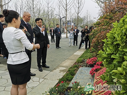 杭州市園林綠化股份有限公司董事長(zhǎng)吳光洪(右二)陪同中央政治局委員、北京市委書記蔡奇(左二)參觀浙江園