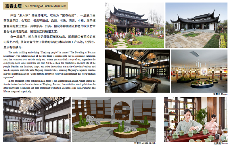 浙江園內(nèi)體現(xiàn)“浙人家”的主體建筑取名為“富春山居”,該建筑以浙派民居為原型,飛檐翹角,格局大氣,盡顯浙江風(fēng)情。深化這個(gè)建筑單體,團(tuán)隊(duì)做了很多功課,花了許多心思,考察了許多浙江特色民居,在充分運(yùn)用現(xiàn)代建筑材料與結(jié)構(gòu)的基礎(chǔ)上,通過(guò)對(duì)浙江傳統(tǒng)民居建筑的經(jīng)典片段提取和抽象提煉,賦予這些元素和符號(hào)以新的意義,構(gòu)建出浙江傳統(tǒng)民居的新風(fēng)貌。它不是對(duì)傳統(tǒng)民居建筑的照抄照搬,而是繼承和創(chuàng)新,設(shè)計(jì)了一棟獨(dú)一無(wú)二的建筑。
