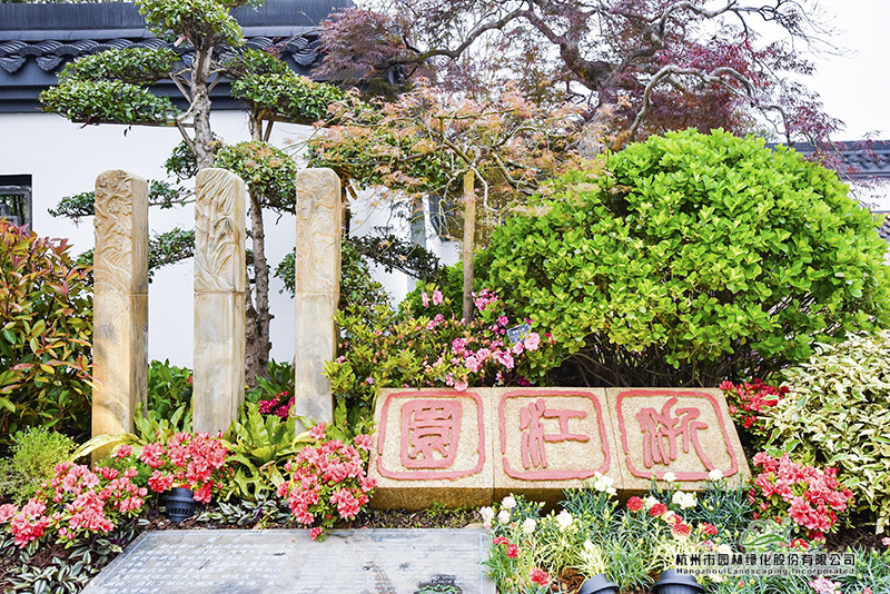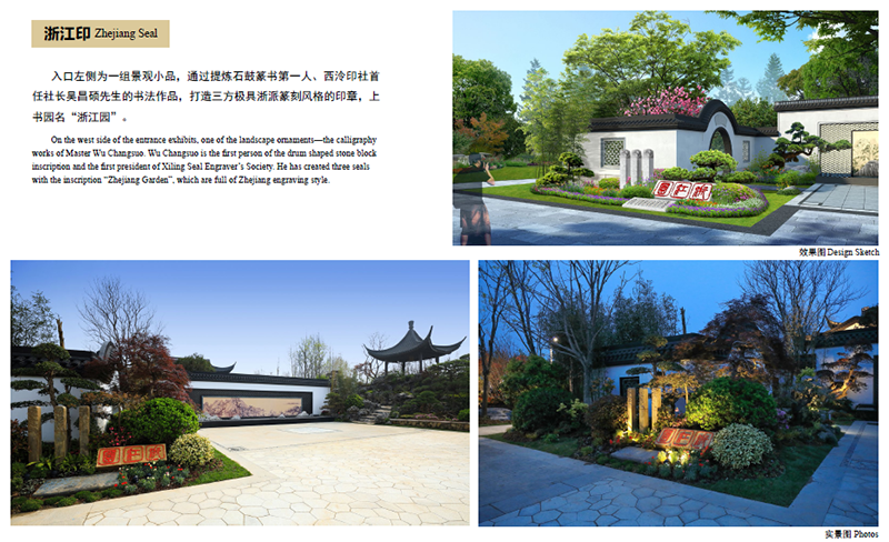 位于浙江園主入口西側(cè)的景觀小品“浙江印”,提煉自石鼓篆書(shū)第一人、西泠印社首任社長(zhǎng)吳昌碩先生的書(shū)法作品,三方極具浙派篆刻風(fēng)格的印章上,“浙江園”三個(gè)字,干凈、利落,古樸、大氣。這幅美景的背后,是深化設(shè)計(jì)團(tuán)隊(duì)數(shù)次往返西泠印社,從無(wú)數(shù)的篆刻名家作品中挑選、比對(duì),決定采用最能代表浙江篆刻藝術(shù)的吳昌碩先生字體,從中找出“浙”、“江”、“園”三個(gè)字,在設(shè)計(jì)圖中反復(fù)比對(duì),調(diào)整位置、大小,最終確定下來(lái)。