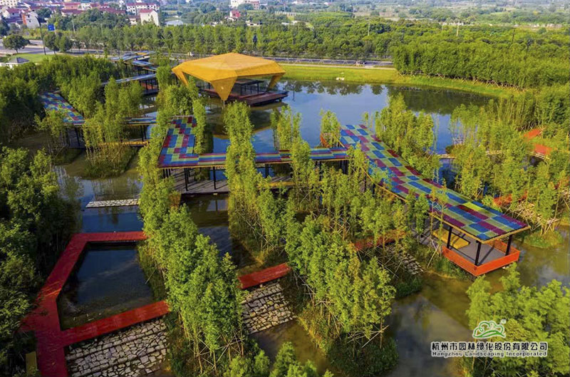 綠道建設(shè)充分融入海綿城市理念,從鋪裝材料的選擇到施工過程,均充分體現(xiàn)生態(tài)環(huán)保,與整個(gè)公園景觀和諧相融,集生態(tài)環(huán)保、觀賞游玩、休閑運(yùn)動(dòng)為一體。沿綠道而行,蜿蜒交錯(cuò)約2公里的空中廊橋,讓人體驗(yàn)林中穿梭、空中漫步;‘鉆石切割、珍珠光澤’的珍珠涼亭,夜晚,在燈光的折射下,會(huì)散發(fā)出迷人的光澤,猶如一串閃耀奪目的珍珠,璀璨奪目。從高空俯瞰,紅色的綠道在碧水綠樹中穿行,將沿途景觀有機(jī)串連,形成一幅風(fēng)格鮮明的生態(tài)風(fēng)景畫卷。