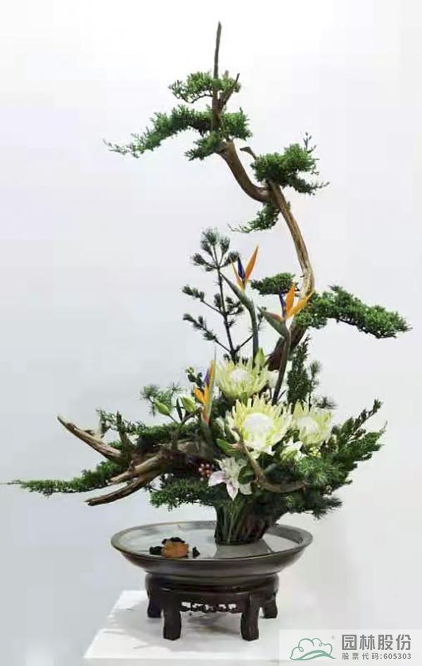 另有極富意境的《云崖青嶠》插花作品,選崖柏、龍柏、鋪地柏、五針?biāo)?、帝皇花、重瓣百合花、粉色和白色金絲桃、天堂鳥,以成云崖青嶠之作。云為雅意,崖寓故訓(xùn),青色入觀,嶠在畫外。如此,松風(fēng)若過,花開舒卷,青紅果結(jié),臨水照影。清澗之曲,碧松之陰,相映成趣,著手成春矣。
