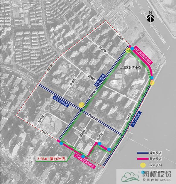 設(shè)計策略:將紅線范圍內(nèi)現(xiàn)有綠道,通過微改造,整合串聯(lián)現(xiàn)有慢行步道、沿河綠道、沿江綠道,形成3.6km的慢行環(huán)線,并納入杭州綠道地圖中。豐富人群出行方式和體驗,提升多路徑可達性。