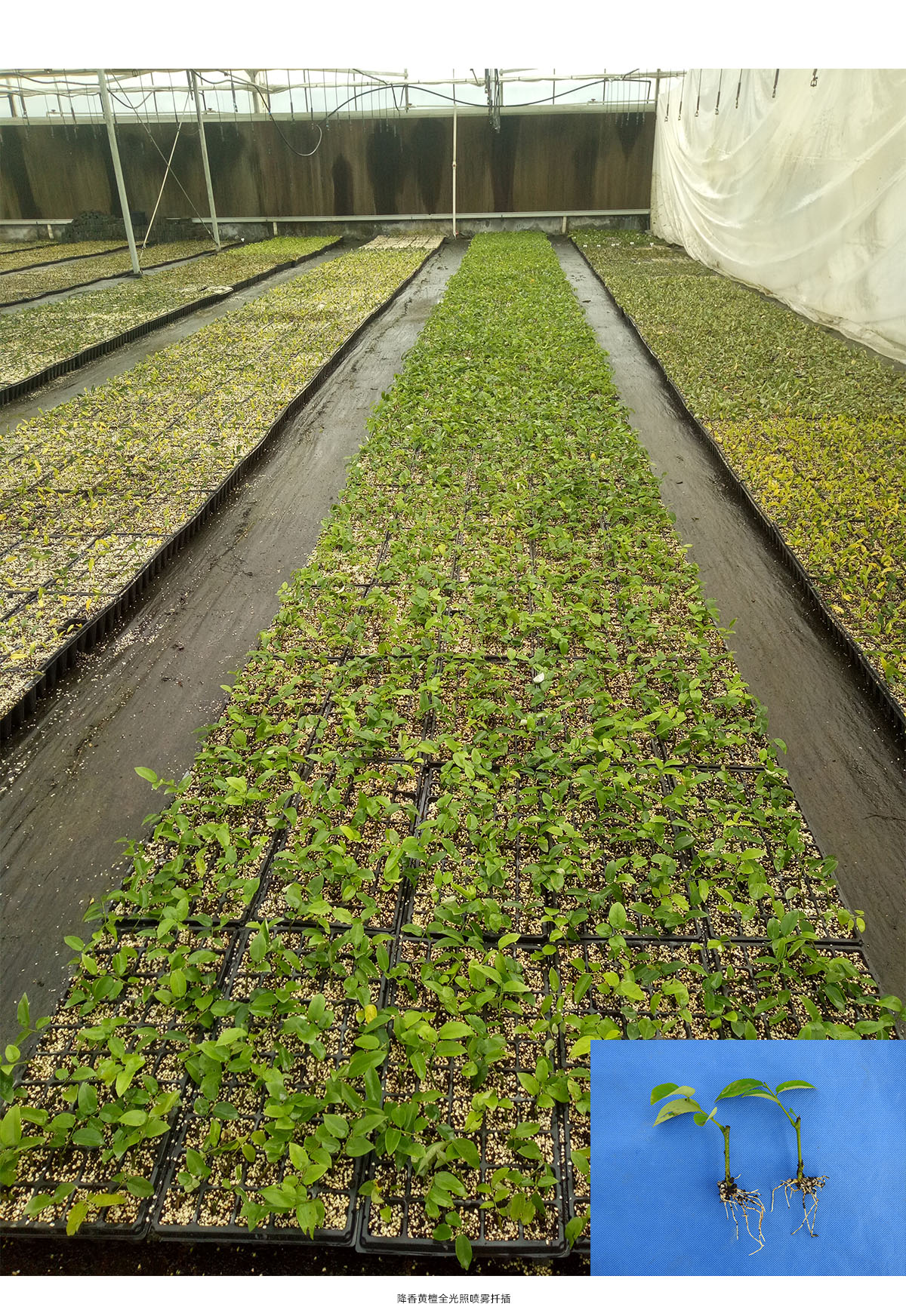 全光照噴霧扦插技術(shù)具有生根期短、成活率高和操作簡單等優(yōu)點。研究院已建立了桂花、冬青、降香黃檀、新優(yōu)宿根植物等數(shù)百種植物的全光照噴霧扦插技術(shù)體系,年度育苗量200多萬。